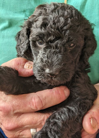 Clara was the tenth/last puppy born and the fifth girl. She’s medium sized and all black except for two tiny white spots on her left hind paw. She does have a little silver on the underside of her paws so it’s possible that she’ll turn silver but we are guessing she’ll stay black. We’ll post updates on color as the puppies grow.
