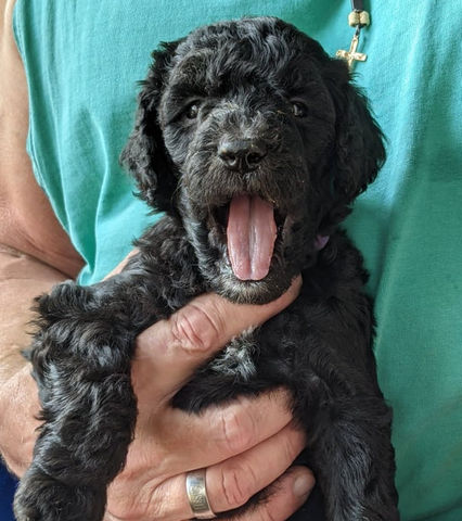 Josie was the eighth puppy born and the forth girl. She’s one of the tiniest little pups in the litter, but she’s very strong and is gaining weight each day. She’s black with the cutest white star on her chest and a white spot on her chin. She’s got silvering on the underside of all four paws so we are watching to see if she turns silver.